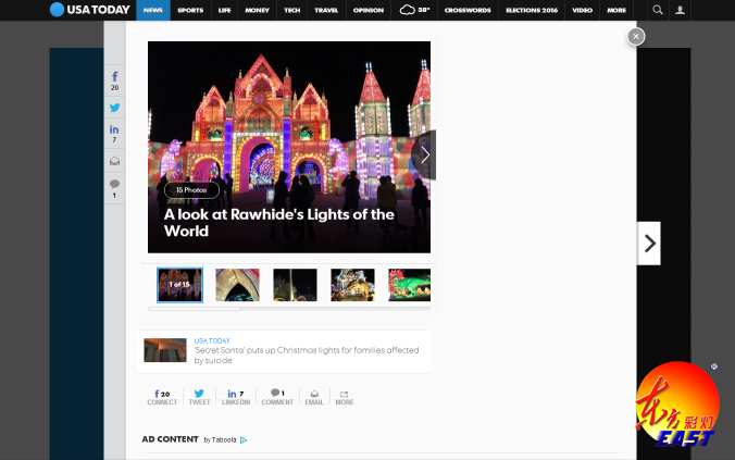 《今日美國》在評論中指出:“2016世界之光——彩燈嘉年華”主題燈展不同于美國住宅燈飾,而是由一支專業(yè)團隊打造的大型夢幻彩燈世界,是值得強烈推薦的圣誕游玩觀賞之地。