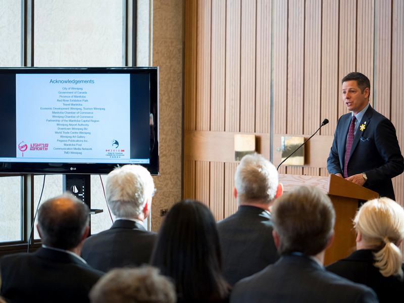 溫尼伯市市長BRIAN BOWMAN發布會上誠邀天下客,共賞東方燈,他說:“北境之光——溫尼伯中華彩燈嘉年華”是“2018中加旅游年”的重頭戲,我們非常期待本次活動,屆時悠久璀璨的中華文明將帶給加拿大民眾一場神奇的光影之旅,也誠摯邀請各國游客來溫尼伯做客。在4月5日召開的曼省議會上專題介紹了本次燈展,并對燈會給予了高度評價。會上全體省議員集體起立,為燈展項目鼓掌一分鐘。