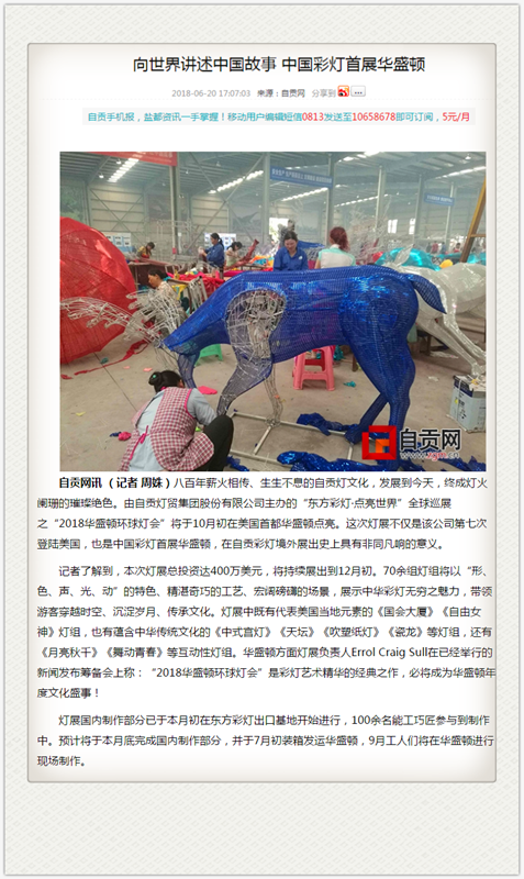 自貢燈貿集團股份有限公司主辦的“東方彩燈·點亮世界”全球巡展之“2018華盛頓環球燈會”即將于2018年10月-12月在Washington D.C隆重展出。本次燈展國內制作燈組已于6月底完成裝箱啟運。