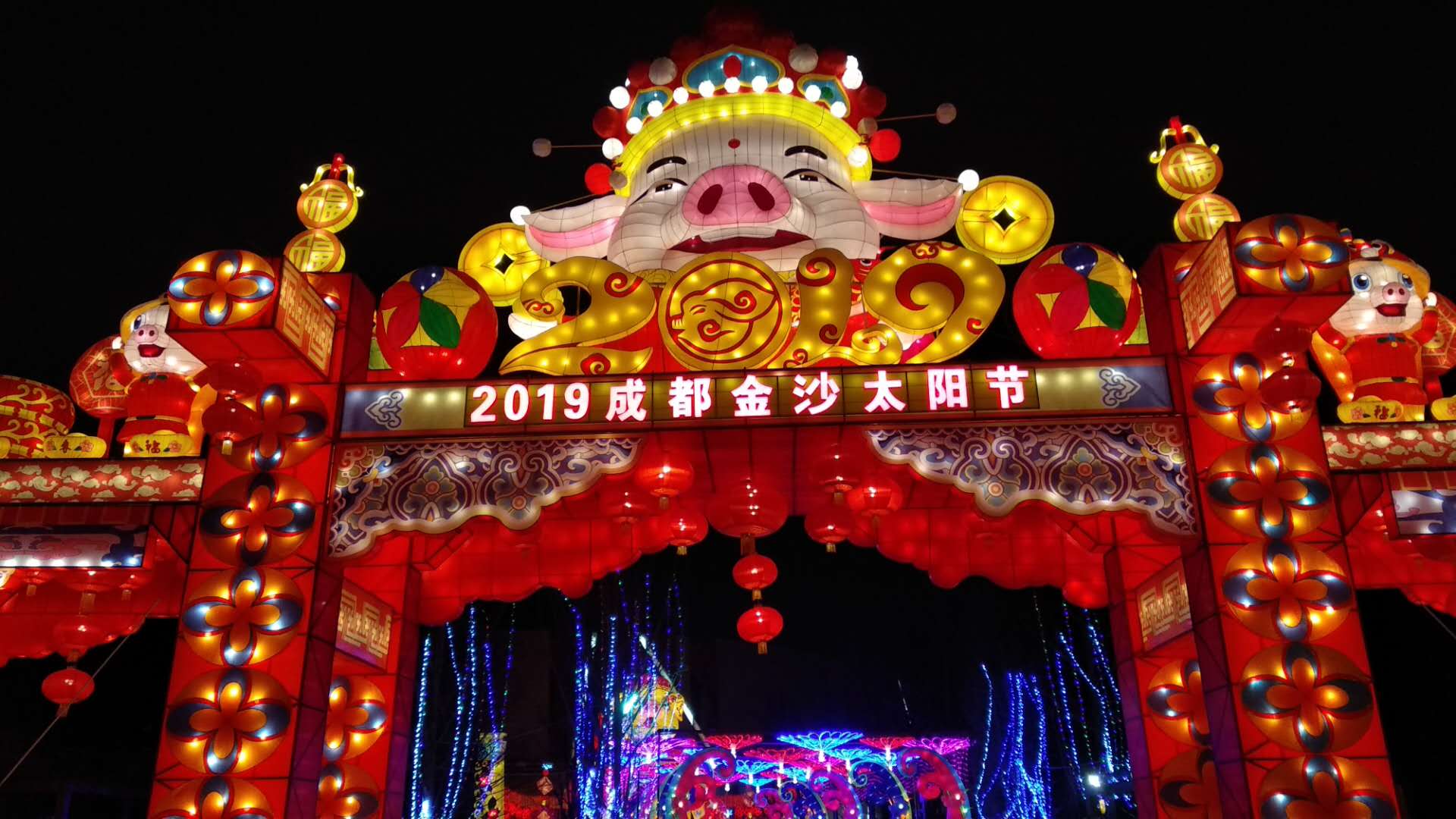 金沙太陽節(jié)史上最大的立體生肖造型,卡通豬組合燈組“金豬賜福”,向游客傳遞豬年的美好祝福。“人逢盛世情無限,豬拱華門歲有余”,歡樂祥瑞的金豬將福澤灑滿天府大地。