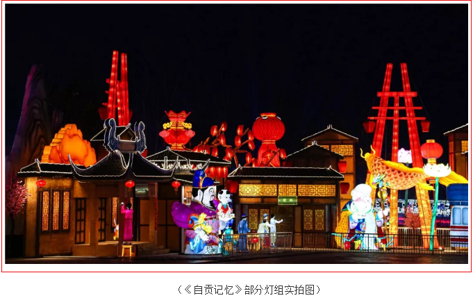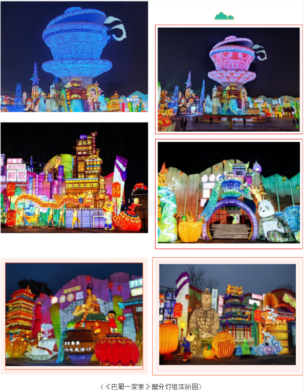 由燈貿集團創意、設計團隊等數百名彩燈匠人歷時兩個多月精心打造的《巴蜀一家親》、《自貢記憶》、《五糧液》三個大型燈組。《巴蜀一家親》薈萃川渝各城風貌之靈光,主體以獨具特色的川渝茶文化代表——蓋碗茶為載體,現代透光材質制作憨態可掬的熊貓,下方高鐵環繞而行,輔以巴蜀特色元素,將自貢傳統彩燈制作工藝與新技術相結合,為游客帶來可看、可聽、可聞的沉浸式的觀燈體驗。