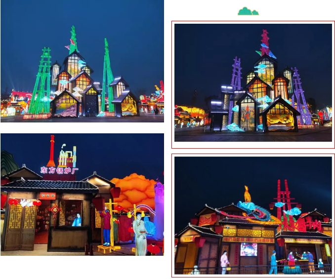 《自貢記憶》主燈組使用傳統材質結合現代工藝,宏偉的天車獨創性的使用啤酒瓶制作,配合追光變色形成絢麗奪目的燈光效果。顯示屏剪影式表現自貢元素。恐龍穿行、錦鯉游動,還有靈活靈現的自貢歷史場景和人物,還原了一幅原滋原味又生動的老自貢記憶。
