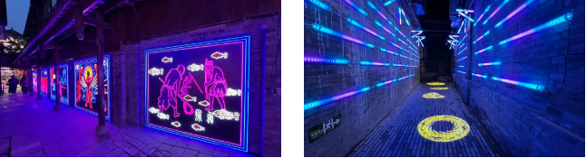 燈展還利用寬窄巷子獨特的建筑形式,在“寬徑”兩邊的墻壁上,用光雕、LED、互動投影等形式打造了長達80米的“時間長廊”。隨著游客參觀的腳步,古蜀人祭祀、漁獵、制陶、冶金、治玉等生活片段如連環畫般漸次出現。