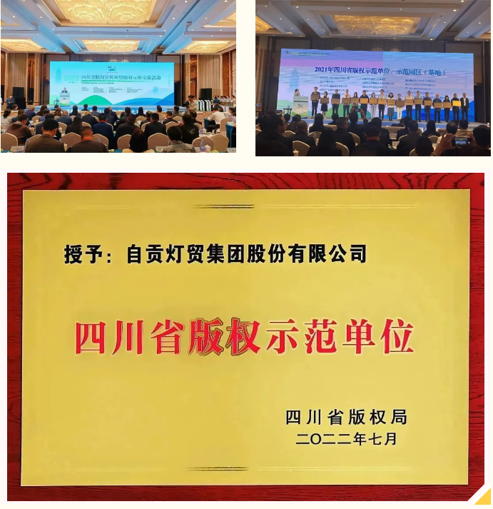 在第23個世界知識產權日來臨之際,由中國版權協會、四川省委宣傳部版權局主辦,綿陽市委宣傳部承辦的“四川省2023版權宣傳周暨版權示范交流活動”于2023年4月25日在綿陽舉行,活動以“推動版權創新創造 助力文化自信自強”為主題,以線上線下聯動方式同步推出。活動當天,省版權局為2021至2022國家級、省級版權示范單位和示范園區(基地)授牌。自貢燈貿集團股份有限公司參加了活動,并獲頒“四川省版權示范單位”榮譽稱號。